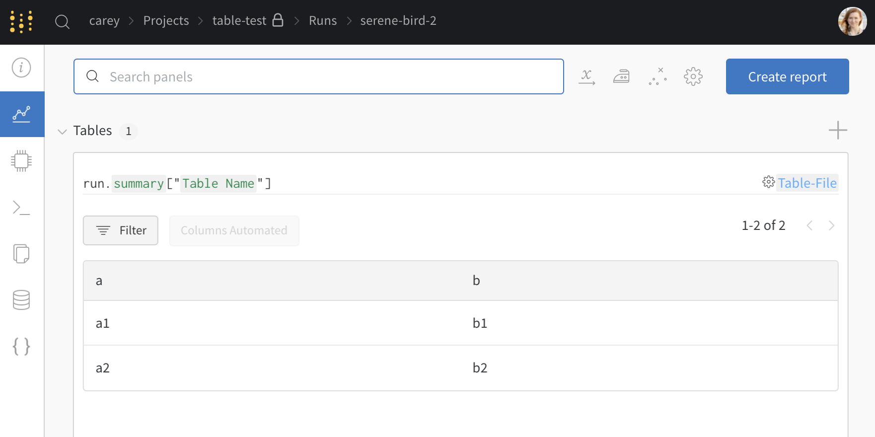my_table = wandb.Table(columns=["a", "b"], data=[["a1", "b1"], ["a2", "b2"]])